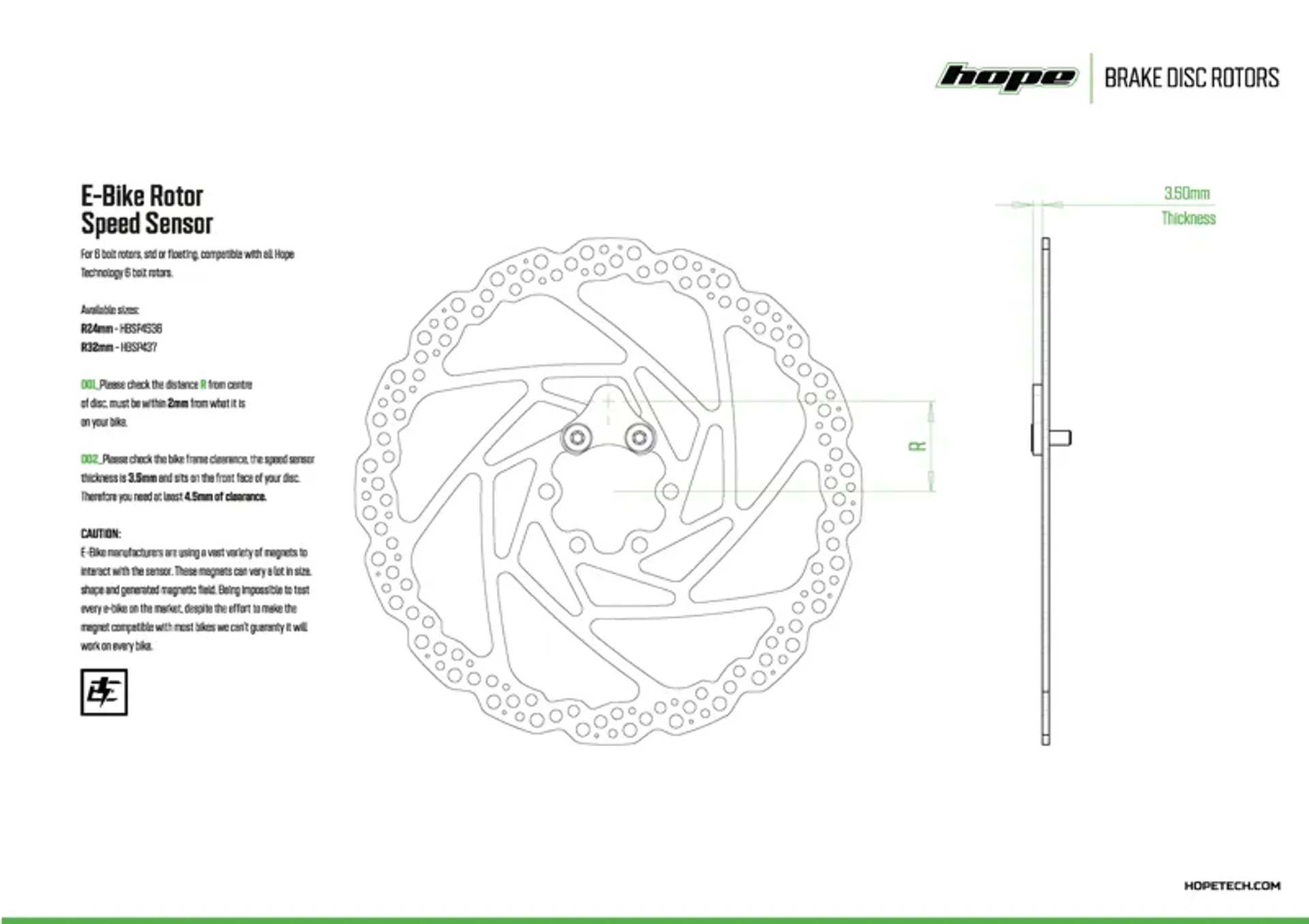 These sensors are compatible with Hope 6-bolt rotors, including both standard and floating versions. The R32 sensor is designed for bikes with a magnet 32mm from the axle centre point. The sensors are 3.5mm thick and require 4.5mm of clearance. Each sensor comes with two bolts for installation.
